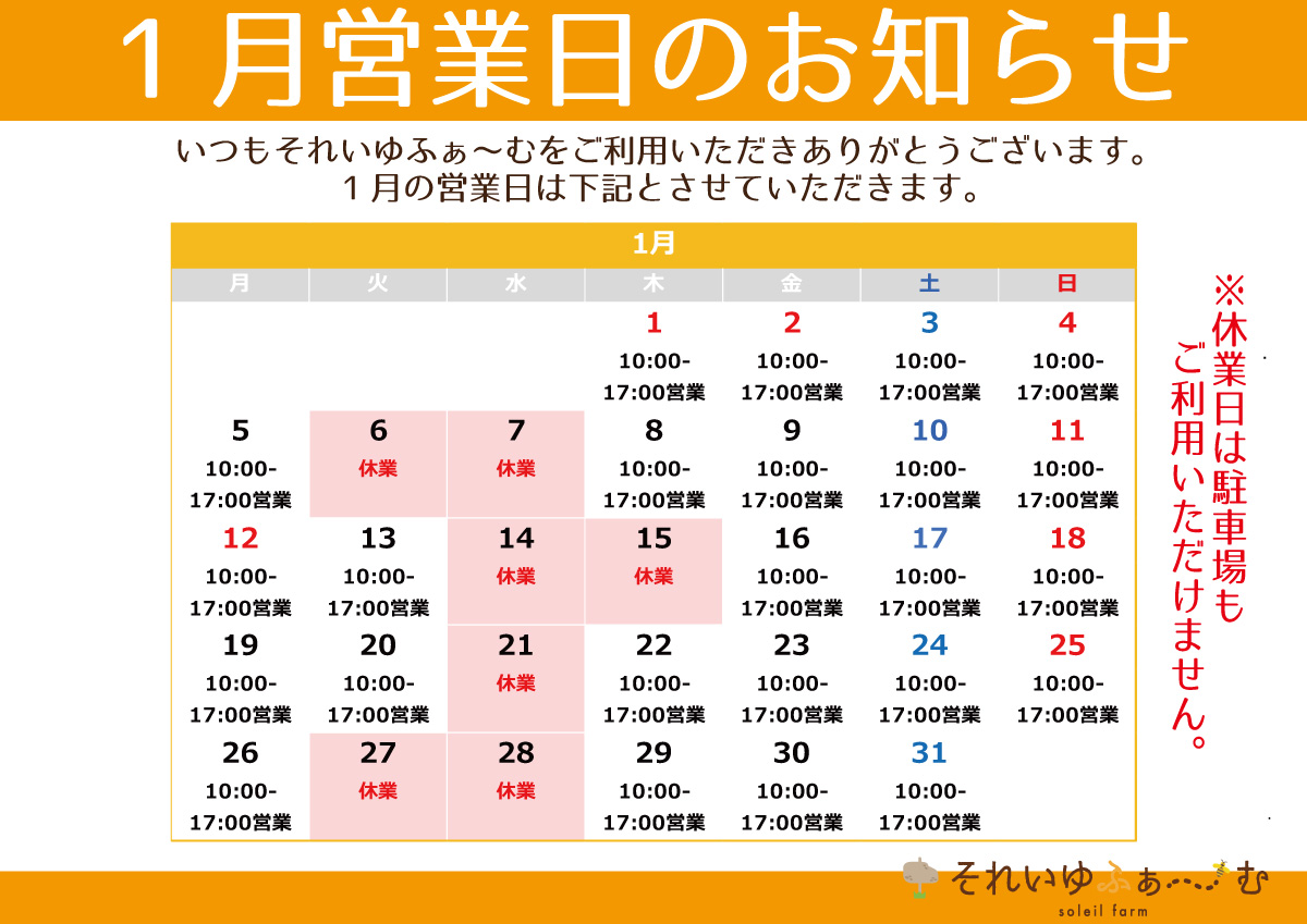 カフェの1月の営業日カレンダーをアップしました。営業日・営業時間につきましてはカレンダーをご覧ください。